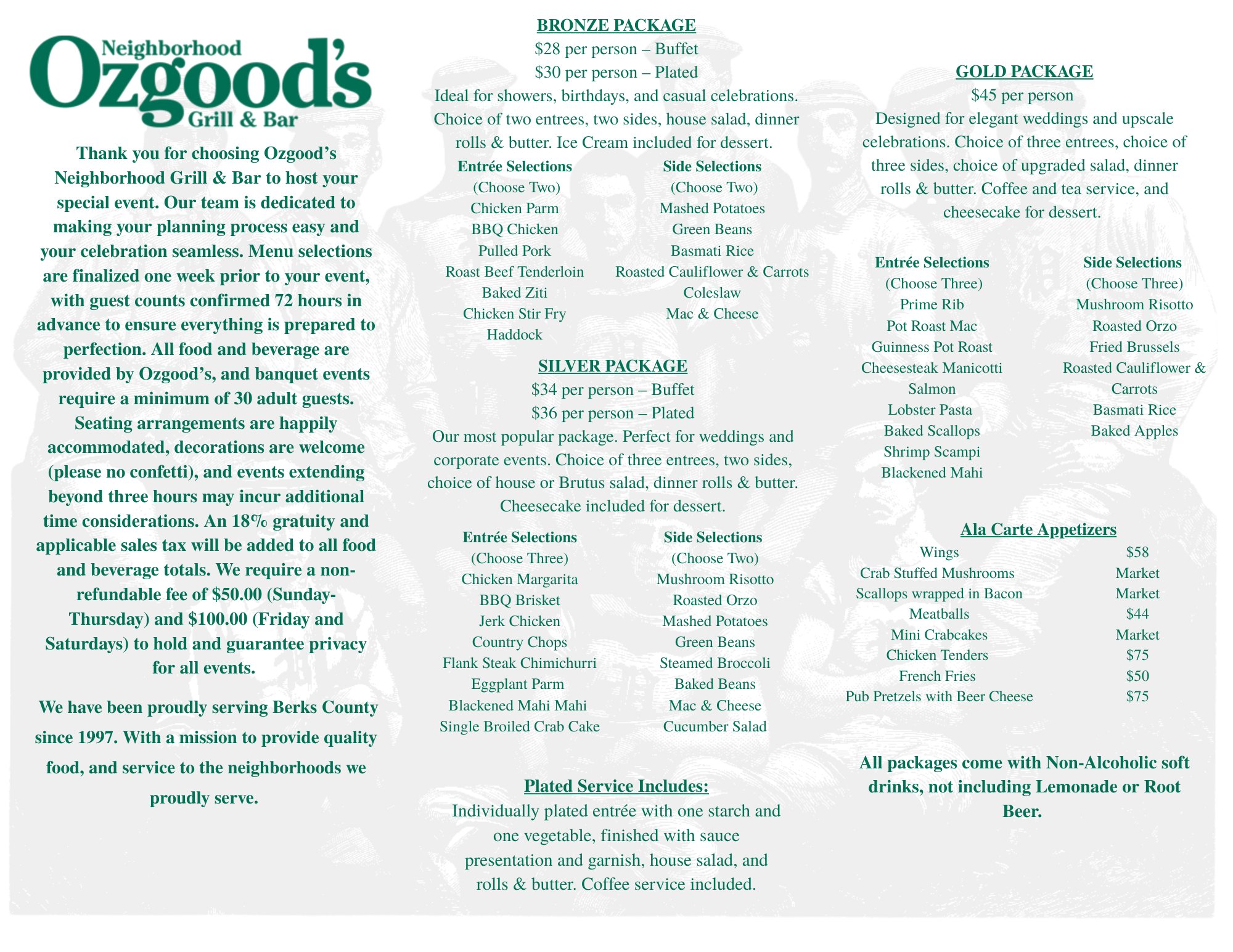 Banquets/Catering Starters Soup & Salads Handhelds Seafood & Pasta Specialties Desserts Banquets/ Catering Kids Host your next banquet with us at our Robesonia location, and now enjoy Ozgood’s catering bringing our great food to your events wherever you are!