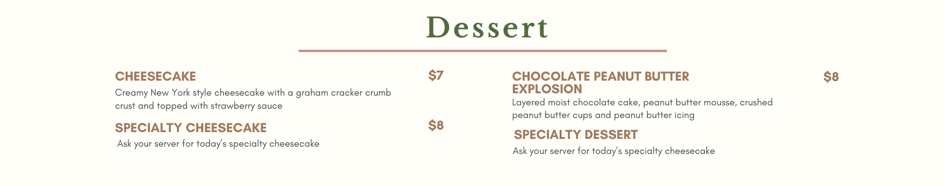 Desserts Starters Soup & Salads Handhelds Seafood & Pasta Banquets/ Catering Kids Desserts Specialties